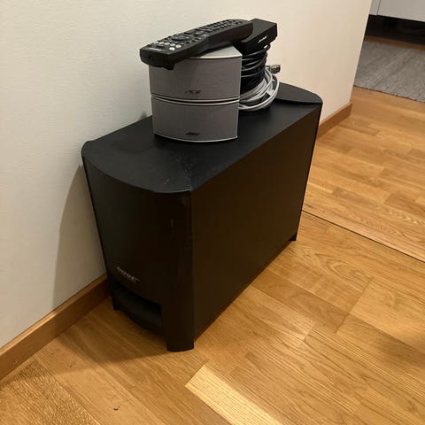 Hemmabiosystem med en Sony STR-DH550, Philips SW966 subwoofer med 4 små högtalare och 1 större och slutligen en Epson EH-TW3200 med enbart 1167 Lamptimmar.