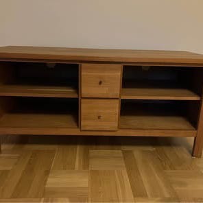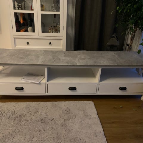 En mycket fin och stabil TV-bänk. Vit med grå skiva i sten imitation. Väl omhändertagen, inga synliga defekter eller märken. Öppna hyllor till höger och luckor till vänster med 1 hyllplan.