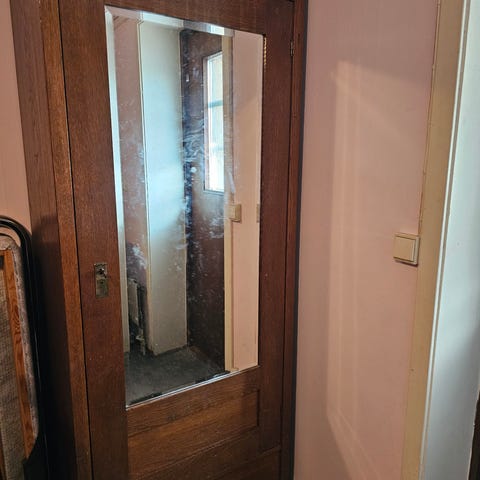 Linneskåp i trä med spegeldörrar, antikt. Obs har ej måtten, men ca 2 meter högt, 1,5 meter brett och 1 meter djupt. Obs uppskattning.