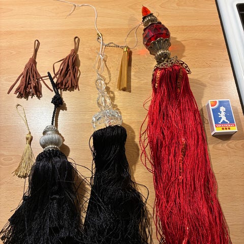 Klassiska gardinomtag med tofsar i brun/beige ton