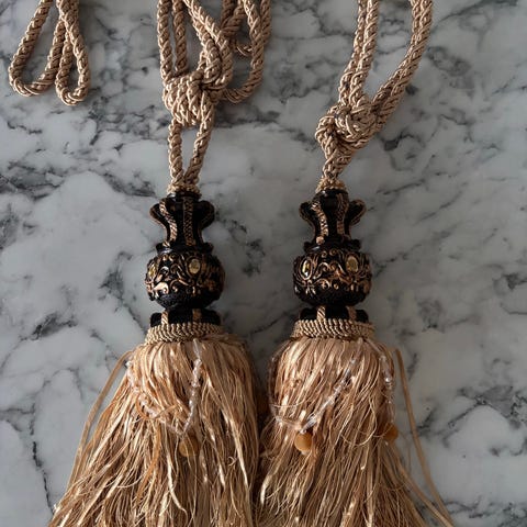 Ett par dekorativa gardinomtag med tvinnat rep och fylliga tofsar i varma brun- och beige nyanser. Vackra detaljer med klassiskt utformade ornament och små dekorativa inslag som ger en elegant och tidlös känsla. Perfekta för att hålla upp gardiner på ett stilfullt sätt och samtidigt lyfta inredningen. Passar både traditionella och lantliga hem.