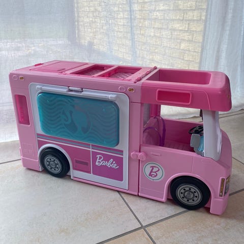 Söt rosa leksaksbil som kan öppnas upp till ett litet lekhus/husbil. Perfekt för kreativ lek! Innehåller kök, bord, stolar, servis, matleksaker, pool och andra små tillbehör