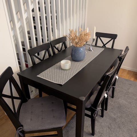 Svart runt matbord från IKEA, modell Ingatorp. Bordet är utdragbart med en iläggsskiva. Fyra svarta stolar med grå tygsits ingår.