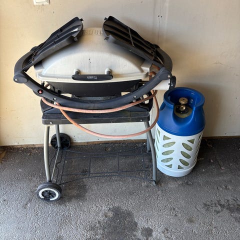 Weber Q320 gasolgrill med två brännare, integrerat stativ och sidobord. Passar perfekt för altan, uteplats eller balkong där gasolgrill är tillåten. Grillen är i fint skick och fungerar som den ska.