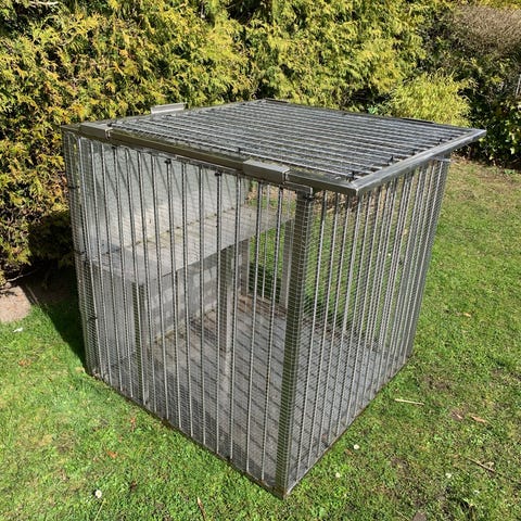 Kaninbur för utomhusbruk med flera separata fack. Buren står på ben och har nätade framsidor samt luckor för åtkomst till varje fack. Passar för hållning av kaniner eller mindre gnagare i trädgård eller på gård. Konstruktionen är anpassad för placering utomhus nära vägg eller staket. Funkar även bra för höns.