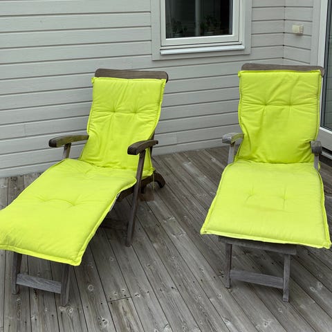 Däckstolar med fotpallar i vit färg. Stolarna har hög rygg, armstöd och separat fotpall i samma stil. Passar för uteplats, altan eller trädgård som sitt- och vilomöbel.