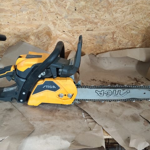 Stiga SP 375 motorsåg med bensinmotor. Sågen har svärd med kedja och är utförd i gul och svart färg. Utrustad med främre och bakre handtag samt kedjeskydd. Lämplig för kapning av ved och allmänna sågjobb i trädgård och skog där en bensindriven motorsåg behövs.
