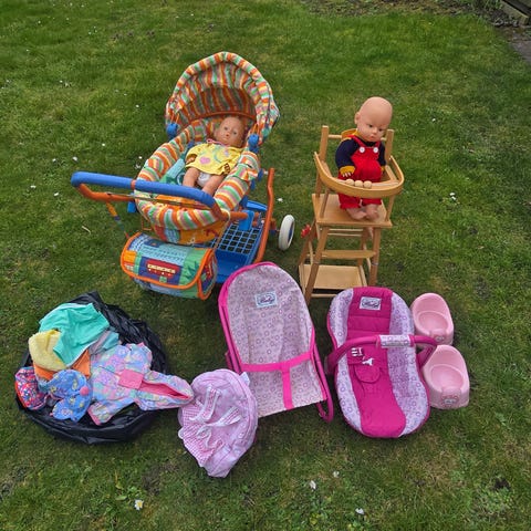 Baby Born dockbilbarnstol i hård plast med tygsits. Stolen är i rosa och lila med gula detaljer och har motiv med kanin och andra figurer i sitsen. Utrustad med bärhandtag som kan fällas samt enkel sele för att spänna fast dockan. Passar för lek med dockor och kan användas både som bärstol och sittstol för dockan.
