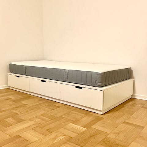 Ikea Nordli säng med förvaring och madrass i grått och vitt. Sängen har utdragslådor undertill som ger extra förvaringsutrymme. Madrassen är en resårmadrass ur serien Hövåg med quiltat överdrag. Passar som enkelsäng i sovrum eller gästrum. Alla delar är från Ikea och utformade för att användas tillsammans som komplett sänglösning med förvaring under liggytan.