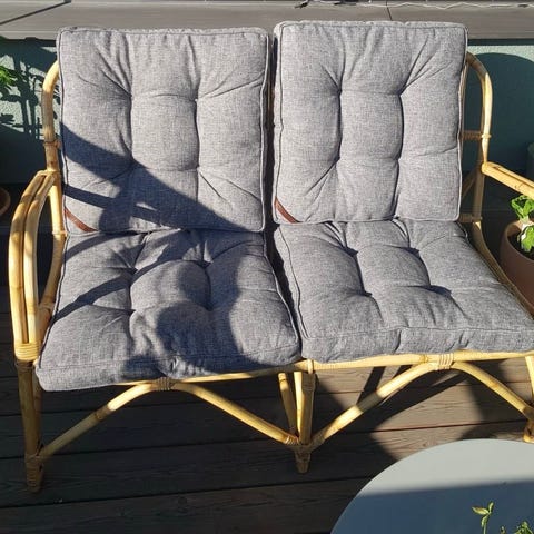 Fåtöljer i rotting med lösa mörkblå dynor.