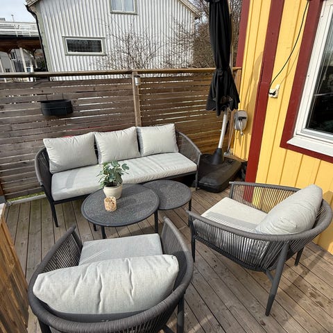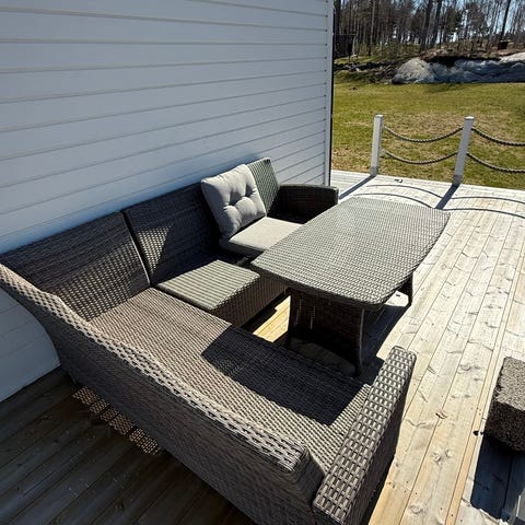 Utemöbelgrupp i konstrotting märke Atleve inköpta på Kila Möbler bestående av en tresits soffa, två fåtöljer och ett ovalt soffbord med glasskiva. Stommen är i flätad rottinglook i mörkare naturton. Dynorna är tjocka och stoppade i beige tyg på både sitsar och ryggar. Soffbordet har underhylla för förvaring. Passar för uteplats, altan eller inglasad balkong.