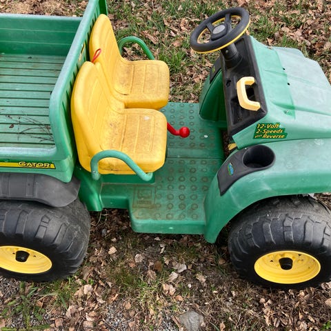 John Deere elbil leksaksbil med 12-volts batteri och två hastigheter samt backväxel. Modellen är utformad som en liten arbetsbil med flak baktill för last. Fordonet har två gula sitsar, ratt med enkla reglage och stora plastdäck anpassade för lek utomhus. Karossen är grön med gula detaljer i typisk John Deere-design. Passar som batteridrivet fordon för barnlek på gård, uppfart eller liknande plana underlag.