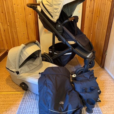 Barnvagn som på bilden har sittdelen monterad, finns även liggdel till den som man ser på bild. Följer med både myggnät och regnskydd för vagnen. Påsen som man kan förvara det i som hänger på sidan av vagnen är lite sliten och solblekt.