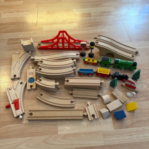 BRIO trätågsbana rälsdelar och tillbehör. Setet innehåller raka och kurvade rälsbitar i trä, korta skarvbitar, höjdklossar, två klossar med murstensmotiv, en växel- eller stoppstation i trä med plastdetaljer samt en rund platta i plast som kan användas som brofundament eller landskapselement. Delarna är kompatibla med BRIOs övriga trätågssystem och kan användas för att bygga ut eller komplettera en befintlig tågbana.