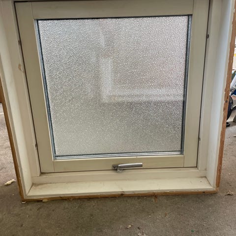 Kvadratiskt 3 glas fönster med vit karm och frostat glas. Fönstret har en öppningsbar båge med handtag i metall. Passar exempelvis till badrum, förråd, källare eller andra utrymmen där insynsskydd önskas. Monteras i vägg enligt standard för fönsterinstallation.