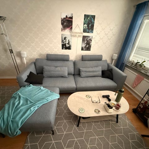 Säljer denna fina soffa då jag tyvärr inte har plats för den. Tyget på kuddarna är avtagbart och alla kuddar är dunstoppade. Låga ben i trä. Sittdjup 62 cm med dynor i. OBS: hämtas och bärs ut av köparen- medtag bärhjälp om du vill köpa den!