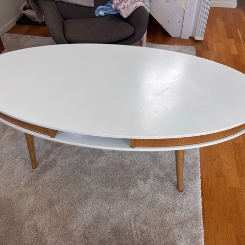 Säljer ett vitt soffbord i klassisk/lantlig stilren design. Bordet har en praktisk underhylla för förvaring av tidningar, fjärrkontroller m.m. Stabil konstruktion som passar bra i vardagsrum.