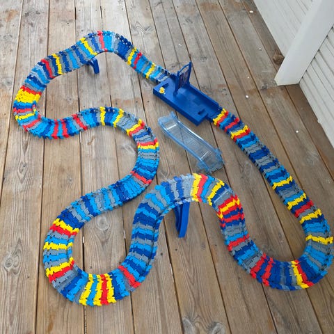 Många meter bilbana som kan läggas ihop till precis den banan du vill! Dubbel uppsättning bilbana, Flera korsningar, tunnlar och roliga tillbehör. En fungerande bil med batteri. Flexibel, kan tas isär och byggas upp utan krånglig manual.