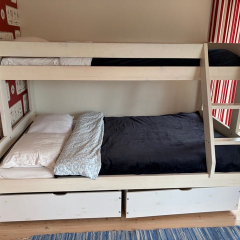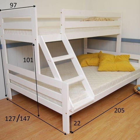 Nedre sängen är 120x200 övre sängen 80x200. Övre delen har aldrig varit monterad.