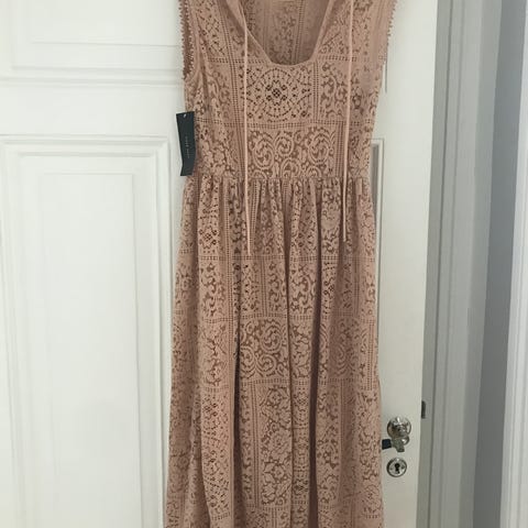 Vacker spetsklänning. Lång bak, kortare fram. Knappar baktill. Storlek 40. Använd en gång, mycket fint skick.
