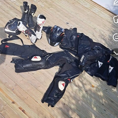 Det finns även handskar och mindre tillbehör som syns på bilderna. Utrustningen är avsedd för motocross eller endurokörning och ger skydd för huvud, överkropp, knän och händer.