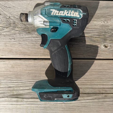 Makita 18V skruvdragare modell DDF480. Fungerar som den ska utan problem. Notera att gummit på handtaget släppt lite.
