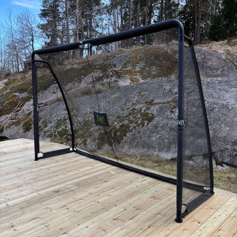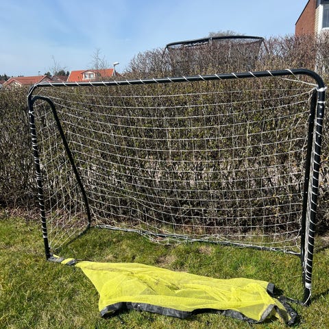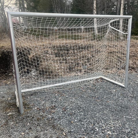 Fotbollsmål med nät i vit färg. Stabil ram i metall. Finns på Lidingö nära bron. Går att montera ner.