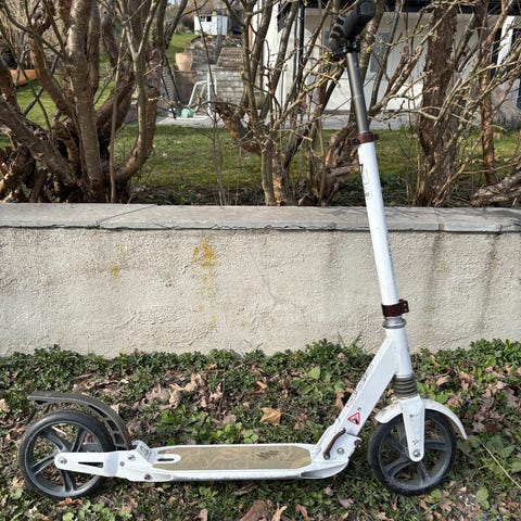 Razor spark kickbike i silverfärg. Hopfällbar modell med två hjul och fotbroms på bakhjulet. Ställbar styrhöjd och ståplatta i metall. Passar som sparkcykel för barn eller ungdomar.