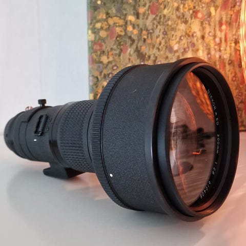 Ett mycket fint 300 mm objektiv med en enklare skyddsväska och originalkartong. Följer även med stativfot som inte är med på bilden.