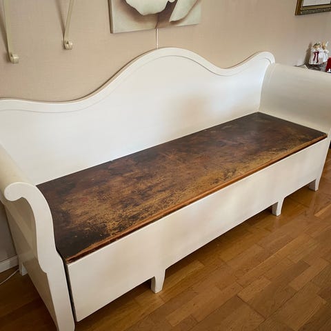 Äldre gedigen kökssoffa i trä med möjlighet till förvaring under locket. Går att dela i tre delar så den är lätt att hämta.