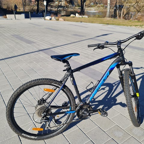 Superbra mountainbike för ungdom. Bianchi mountainbike, unisex med ramstorlek S och 27,5" hjul. Cykeln har hardtail-ram med framgaffel med dämpning, rakt styre och hydrauliska skivbromsar fram och bak. Utrustad med grovmönstrade däck anpassade för terrängkörning. Färg: svart med blå detaljer.