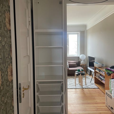 En extra hög Pax garderob från Ikea, svartbrun 50 cm bred stomme med klädstång och fyra lådor i trä. Vit högblank dörr. Lite smårepor på sidorna efter en flytt.