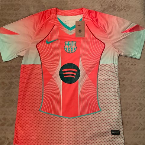 Nike fotbollströja för herr i storlek XL. Tröjan har kort ärm och är i ett lätt och ventilerande material anpassat för fotboll. Färgkombination i turkos, rosa och grå toner med klubbmärke och sponsorlogga framtill. Passar för fotbollsträning, match eller fritid. OBS passar också L