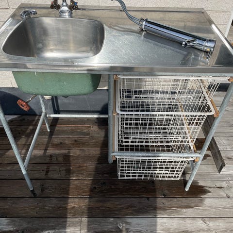 Fin jakt och fiske bänk i rostfritt stål. Diskho med blandare. Bänk samt hyllor..
