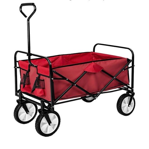 Outlust hopfällbar vagn i blå textil med svart metallram. Vagnen har draghandtag framtill och fyra hjul för enkel förflyttning. Tyget är en tygkorg som kan fällas ihop tillsammans med ställningen för smidig förvaring. Passar för transport av packning, varor eller utrustning vid till exempel utflykter eller vardagsärenden.