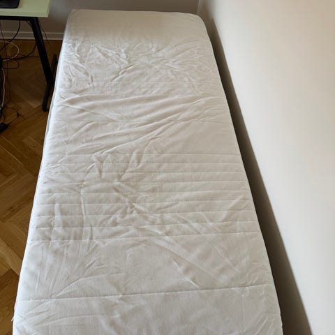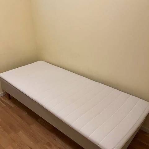 IKEA säng med resårmadrass i vit färg. Sängen står på ben och har en madrass med mönstrat överdrag. Passar som enkel säng i sovrum eller gästrum. Material är textilklädsel med stoppning anpassad för dagligt bruk. Mått och exakt modell framgår inte av uppgifterna och kan mätas vid behov.