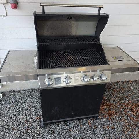 kombigrill kol och gasol i svart metall. Grillen har två separata lock med inbyggda termometrar och grillgaller i metall. Ena sidan är avsedd för kolgrillning och den andra sidan har gasolbrännare med tre reglage på frontpanelen. Under grillen finns en hylla för förvaring. Grillen är monterad på stativ med hjul på ena sidan för att kunna flyttas enklare. Lämplig för utomhusbruk i trädgård eller på uteplats.finns även kokplatta