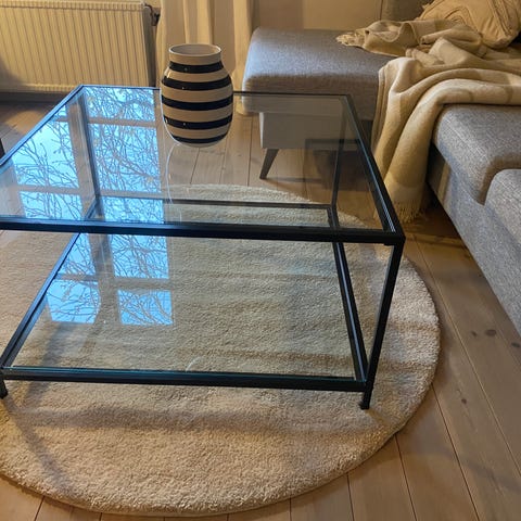 Soffbord i mörk massivt trä med glasskiva. 80 x 80 cm, höjd 49 cm. Felfri glasskiva utan repor.