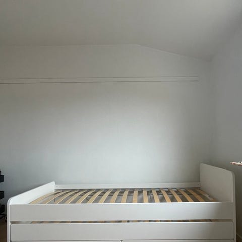 Familjesäng med två bäddar. Den övre bädden rymmer en madrass med måtten 90x200 cm, och den undre 120x200 cm. 2 madrasser ingår tillsammans med två sänglådor som ger bra förvaringsmöjligheter under sängen. Sängen är i fint skick, vi har haft madrasskydd på de madrasser som ingår så de är i fint skick.