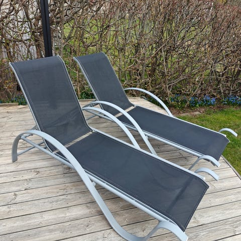 Solstolar med ställning i metall och armstöd i trä. Till stolarna hör tjocka dynor med blommigt mönster i flera färger. Stolarna är fällbara och passar för uteplats, altan eller balkong. Dynorna ger helkroppsstöd från sits till huvud och kan tas av från ställningen vid behov.