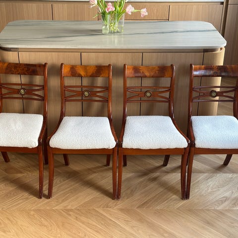 Två omklädda karmstolar i bouclé