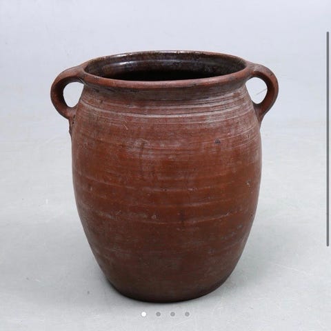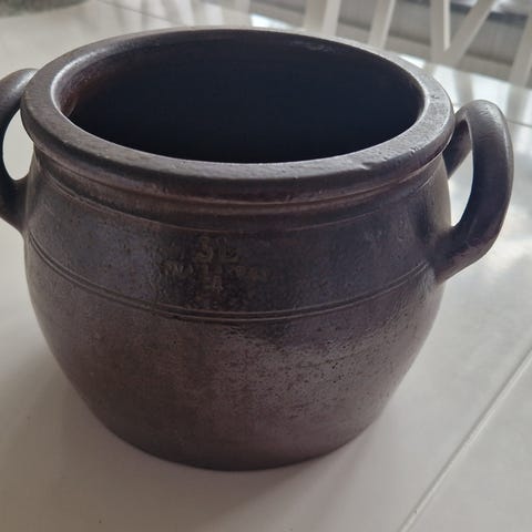 Höganäskruka, 6 liter i keramik med två handtag. Ytan är mörkbrun med lätt strukturerad glaserad finish. Formen är rundad med bred öppning upptill. Krukan kan användas som dekorationsföremål inomhus, till exempel som ytterkruka eller för förvaring.
