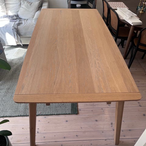 Mio matbord i trä med rektangulär bordsskiva. Bordet har en ljus till mellanmörk träton med tydlig trästruktur. Passar som matbord i kök eller vardagsrum och ger plats för flera sittplatser runt bordet. Bordsskivan vilar på fyra ben i samma träutseende.