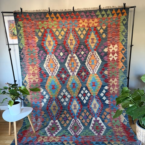 Vacker handvävd Kelim-matta tillverkad av 100% ull i multi färger. Mattorna tillverkas med traditionell kelimteknik. Hantverksmässigt vävd av Turkmener i norra Afghanistan.