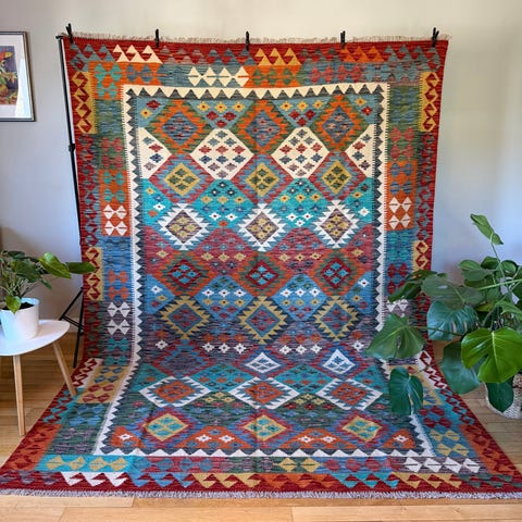 Vacker handvävd Kelim-matta tillverkad av 100% ull i multi färger. Mattorna tillverkas med traditionell kelimteknik. Hantverksmässigt vävd av Turkmener i norra Afghanistan.