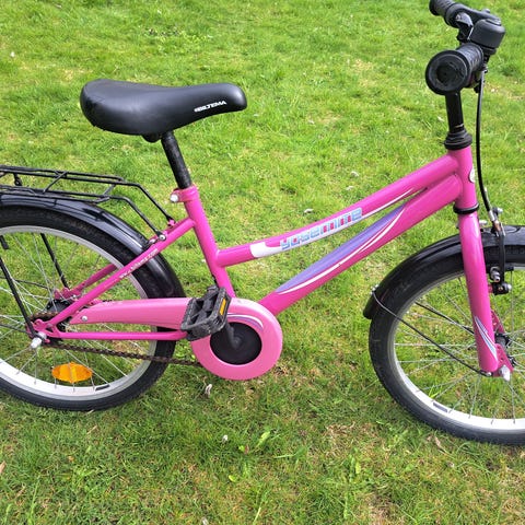 Crescent barncykel med 16" hjul. Cykeln har låg ram som underlättar på- och avstigning för barn. Utrustad med pakethållare bak, skärmar fram och bak samt handbroms fram. Färgen är rosa med dekorer på ramen. Passar som vardagscykel för barn i den storlek som använder 16" hjul.