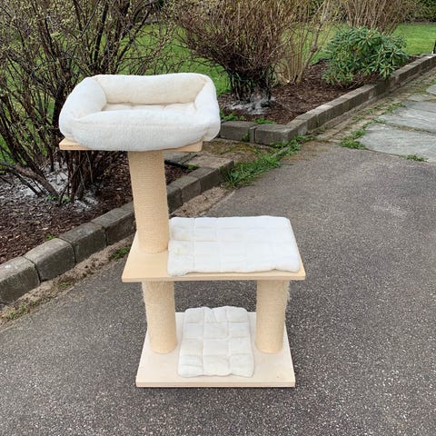 Katträd/klösträd i flera nivåer i vit färg. Utrustad med liggkorg högst upp, hus/koja i mitten, hängmatta längre ner samt flera plan för vila och lek. Stolparna är delvis klädda i rep för klösning. Passar för inomhusbruk till katt för klättring, vila och aktivering.