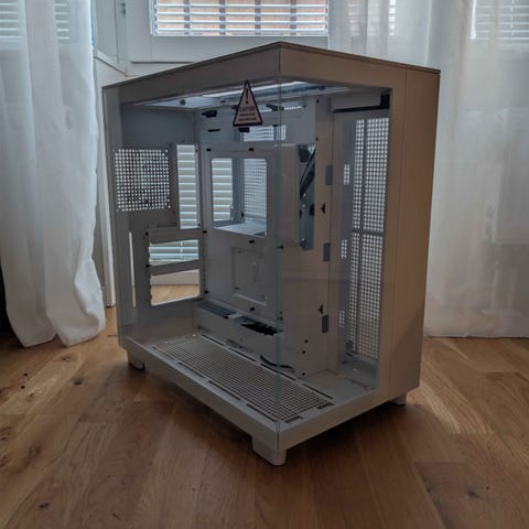 Datorchassi i vitt med sidopanel i härdat glas. Chassit har ventilerade paneler på front, baksida och ena sidan för förbättrad luftgenomströmning. Baksidan har flera expansionsplatser för instickskort samt plats för standard I/O-plåt till moderkort. Frontpanelen är utrustad med strömknapp, USB-portar och ljudanslutningar (enligt bilder). Avsett för stationär datorbyggnation med intern montering av nätaggregat, moderkort, lagringsenheter och kylning enligt standardlayout för moderna chassin.