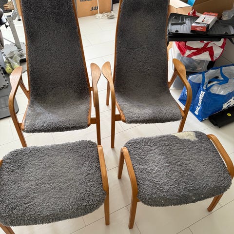 Klädda i möbeltyg Teheran från Svenskt Tenn men som blivit slitet på sittdynan. Två av stolarna har en tygbristning i sittvinklingen - se bild två.