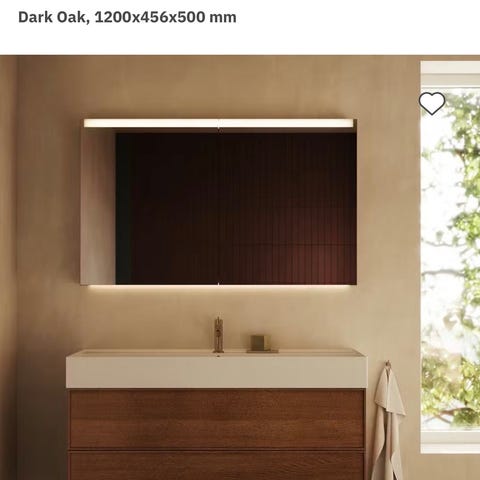 INR Air Wood Dark Oak 80cm badrumsmöbel med spegel INR Slot. Väggmonterad kommod i dark oak träutförande med en utdragslåda och överliggande rund INT Soak tvättställsskål. Bänkskiva med hög blandare. Tillhörande avlång badrumsspegel INR Slot med integrerad belysning runt spegeln.